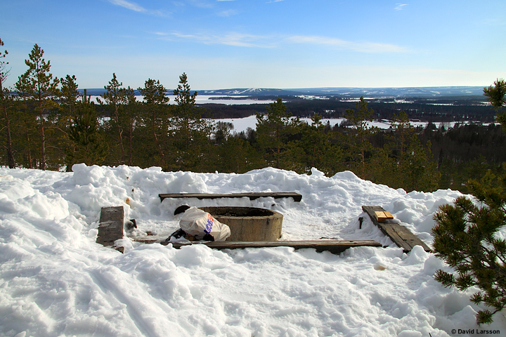 Grillplatsen på Bybergets södra topp. I bakgrunden syns närmast åkrarna vid Böle, längre bort Näsudden och Svensbyfjärden och längst bort slalombacken på Vallsberget.