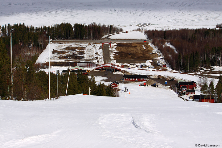 Vy mot bebyggelsen och skidspåren nedanför backen från toppen.