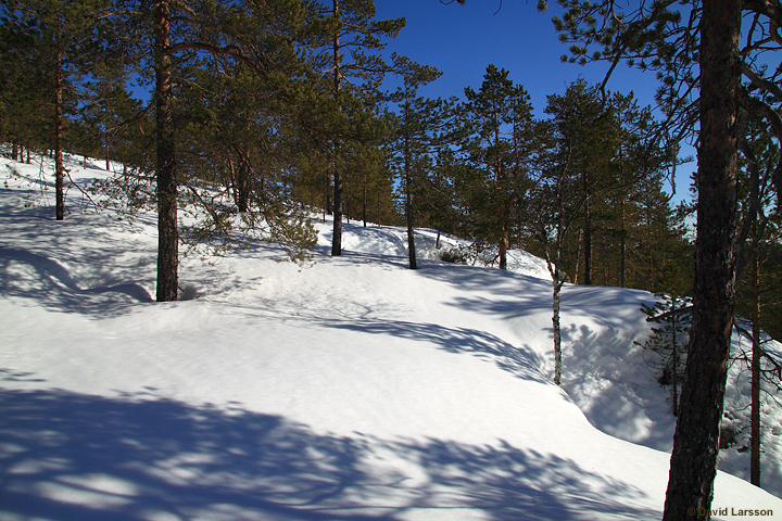 | Skogarna i bergets sluttning mot söder och väster har varierande karaktär, men stenig och blockig terräng förkommer. Vid stora snödjup på vårvintern är terrängen lättare att upptäcka på skidor. |