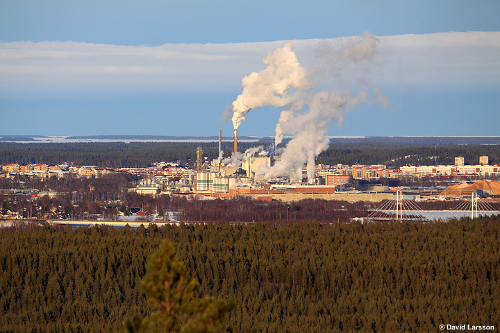 Detaljvy mot Piteå med det stora pappersbruket i mitten, här syns även E4-bron över Piteälven.