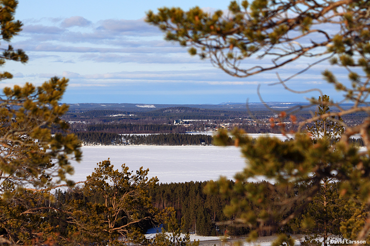 Vy mot Öjebyn från Fagersbergets västra topp med Öjeby kyrka mitt i bild.