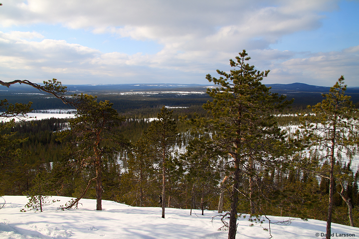 | Västerut breder höglandets sammanhängade skogsområden ut sig samtidigt som höjden snabbt stiger upp mot 400 meter över havet. Redan Skogberget till höger i bild är nästan hundra meter högre än Kalahatten. |