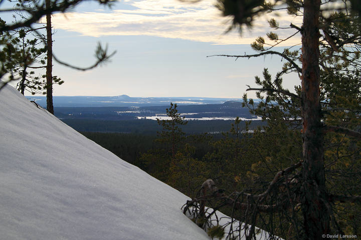 | Från Byberget har man utsikt mot många andra berg. Två som tydligt avtecknar sig vid horisonten är Kalahatten till vänster och Gölaberget till höger, här sedda från södra toppens västsluttning. |