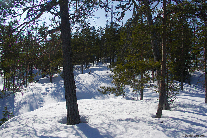 Terrängen uppe på bergets hjässa är småkuperad, här växer tallskog av varierande täthet. Vy från östra sidan upp mot högsta punkten.