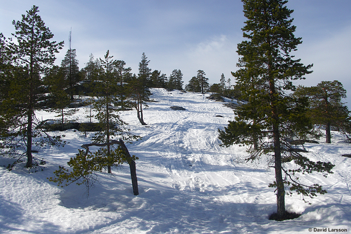 | En del av Kalahattens bergiga hjässa sedd från östra sidan där leden går upp mot toppen. Här finns ledens största lutningar, men övriga sidor av toppen är betydligt brantare. |