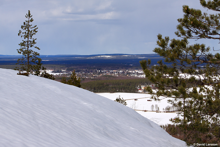 Utsikt mot Sjulnäs från sluttningen vid Larssonsbergets topp.